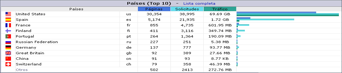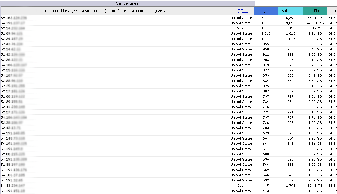 Según lo que vemos, ninguna IP en EEUU baja de un consumo de 1GB y en España, el consumo diario de todas las visitas, era de unos 300MB!