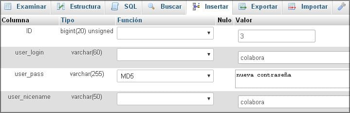 Aparecen varios campos con la información del usuario, vas a user_pass y verás que aparece un texto aleatorio, borras su contenido, y escribes tu nueva contraseña en su lugar.