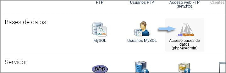 Primero debes tener la información de acceso al panel de control cPanel o panel de administración de tu hosting y dirigirte a Bases de datos > Acceso a Bases de datos (según este ejemplo)